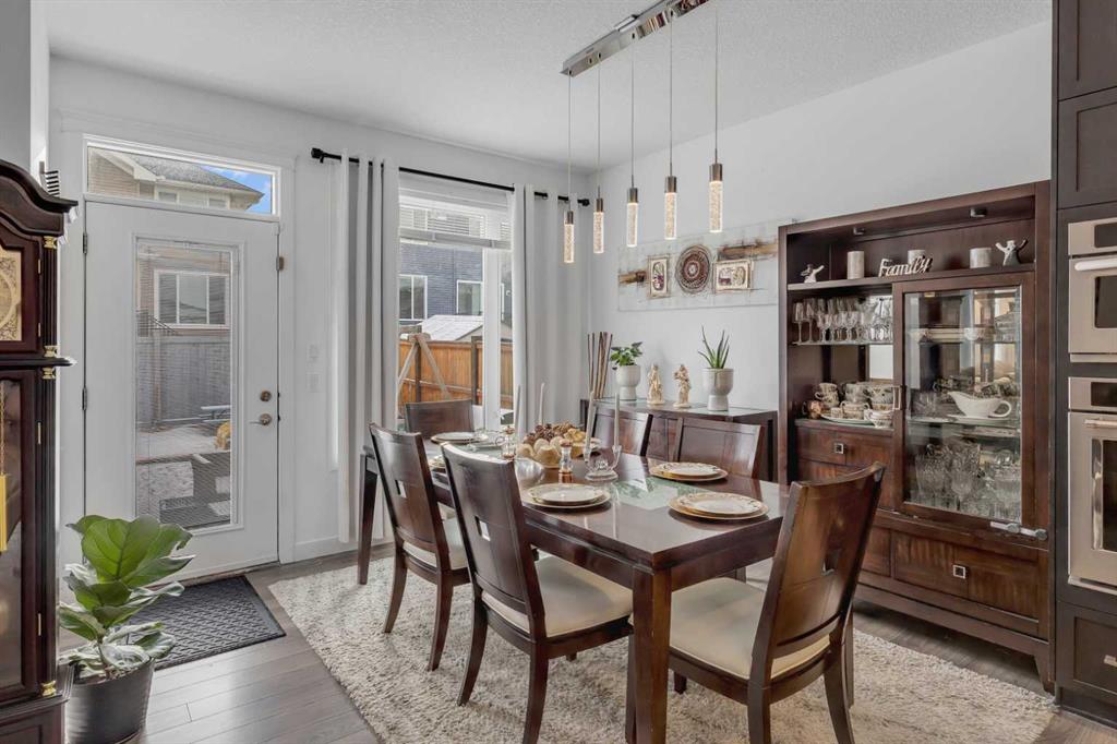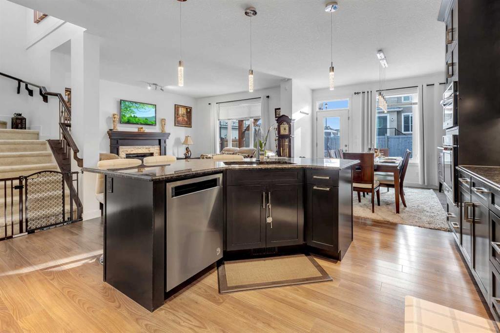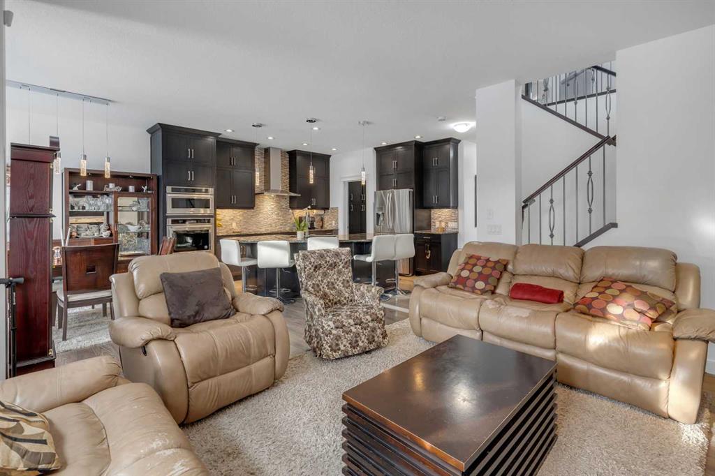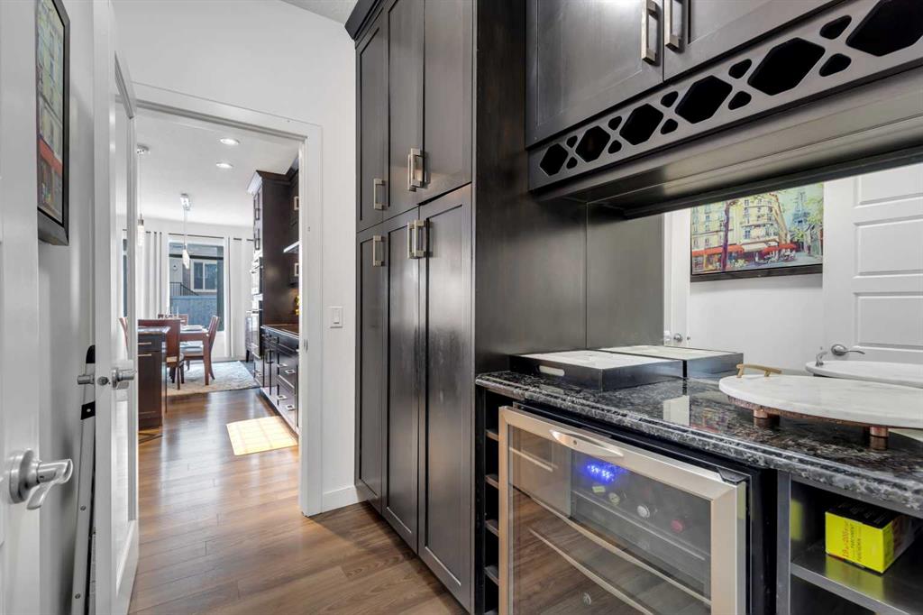 As you enter, you’ll notice the numerous extras that enhance this home. The main floor includes an oversized den, perfect for your home office, and an amazing chef’s kitchen. The kitchen boasts a walk-through pantry and custom built-in cabinetry, complete with a bar area, stainless steel appliances, granite countertops, and ceiling-height cabinets. It seamlessly opens to the dining and living room. Patio doors lead to the back deck and an exposed concrete patio, ideal for outdoor entertaining.