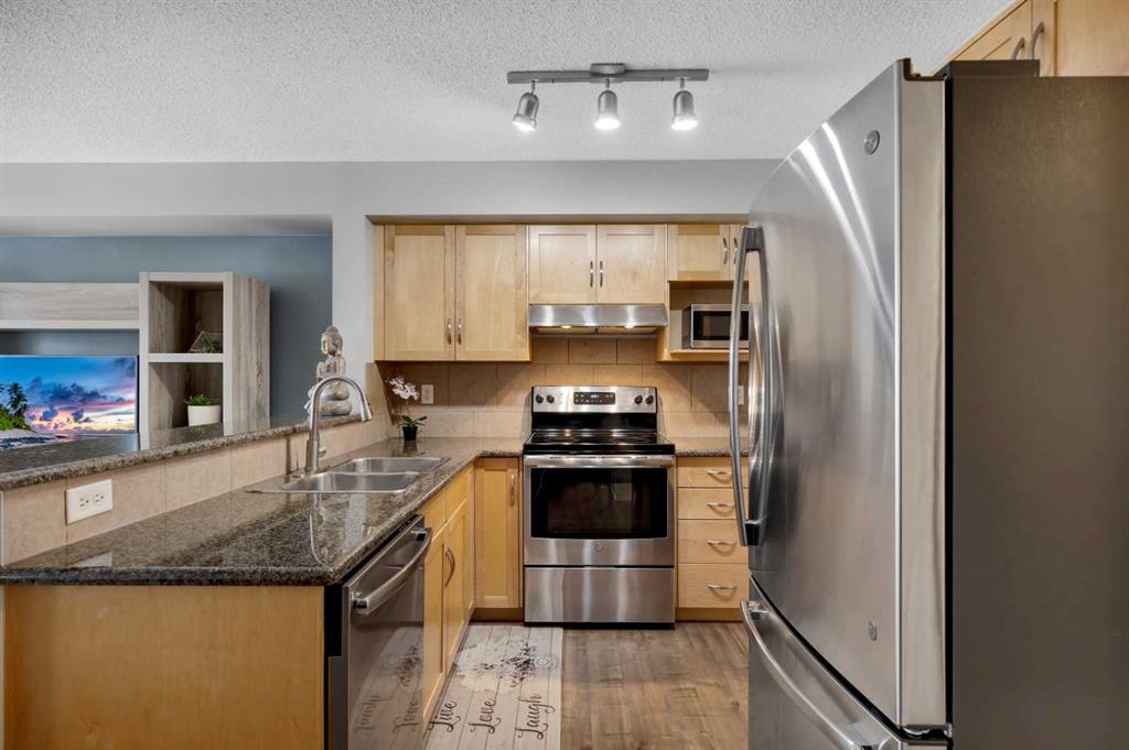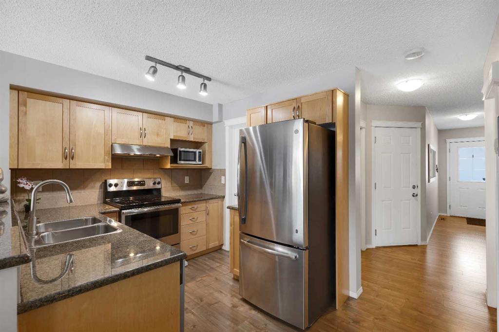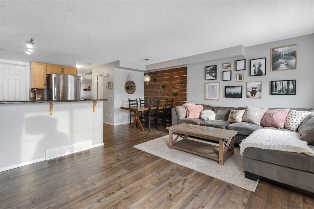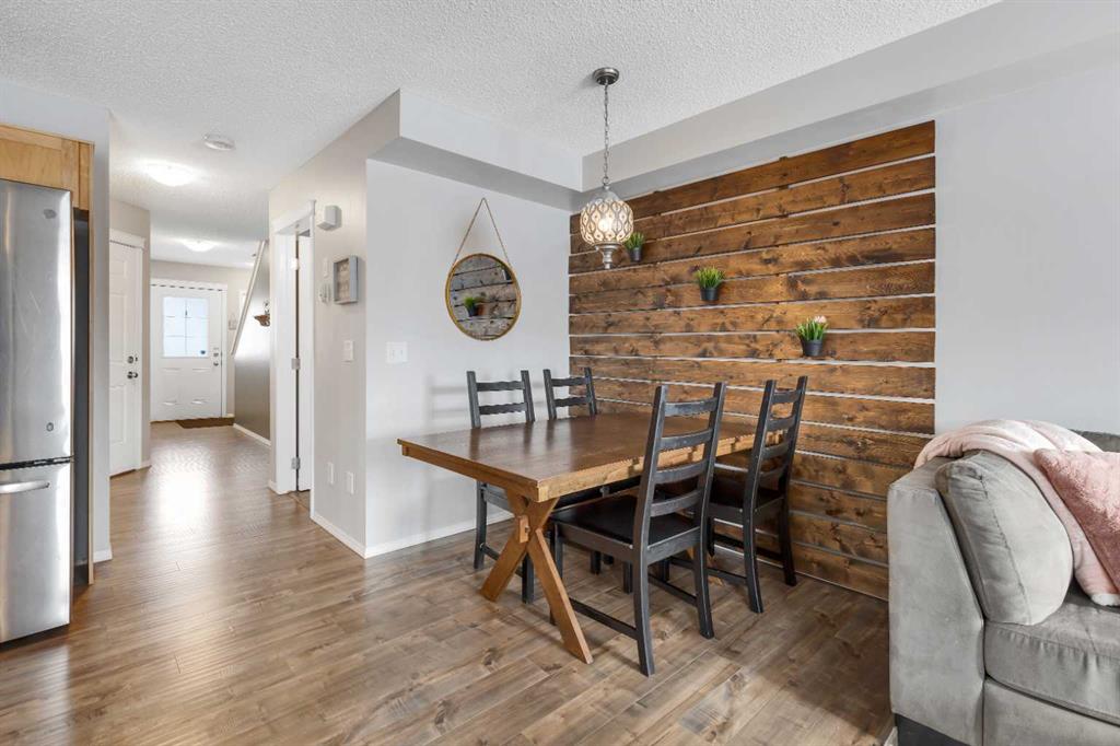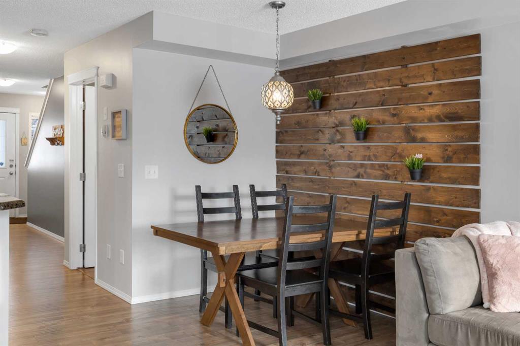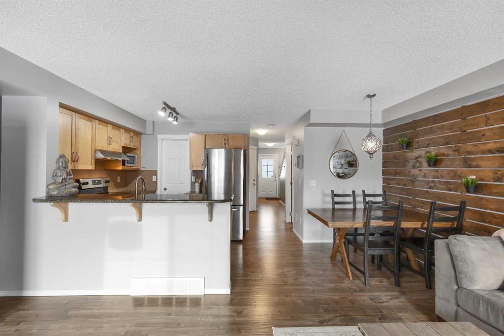 The main floor is thoughtfully designed with a 2-piece bathroom, a large living room with a cozy breakfast nook, and a U-shaped kitchen equipped with stainless steel appliances, granite countertops, a raised eating bar, and a generous pantry. The beautiful laminate flooring throughout the main level adds a modern touch, while the enclosed single garage provides a warm retreat during cold Canadian winters.